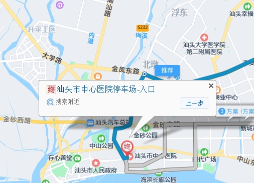 2、从汕头站北门乘坐公交车K2路(K2老港快线),在汕头大学北门下车, 步行约470米至榕华路华侨中学站,乘坐公交车T1路(T1潮南快线), 在迎宾路下车,步行约400米,即可到达汕头市中心医院。