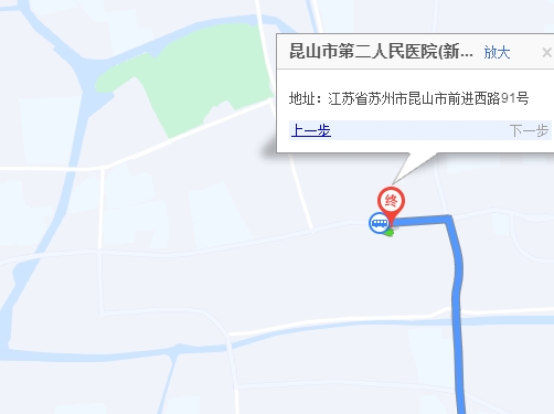 步行480米 昆山南站 步行 280米 昆山南站上车 昆山3路 末班发车22:30 13站 第二人民医院站下车 步行 210米 昆山市第二人民医院(新院区)