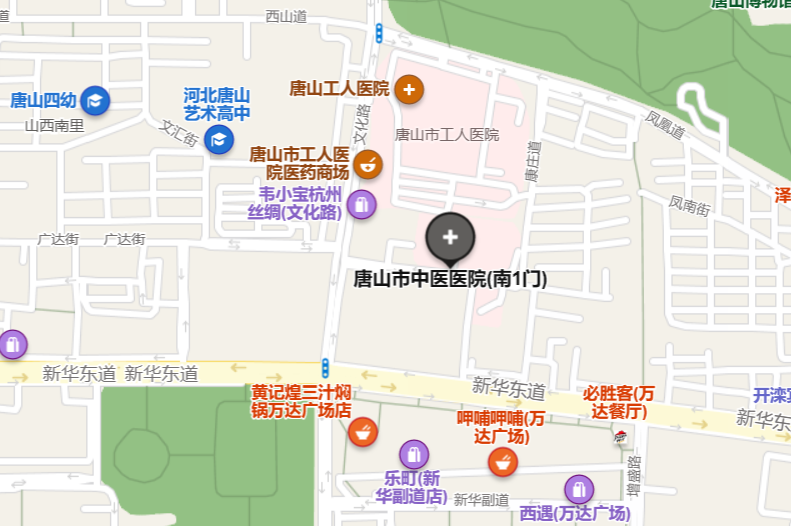 唐山北站50米向西步行 到 唐山北站10站乘 D03路 (唐山南站方向) 到 百货大楼1.4公里向西南步行 到 唐山市中医医院