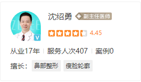沈绍勇医生,副主任医师,工作17年。他是业内的颌面整形外科专家,曾任重点军事院校,三级医院整形外科中心副教授,从事整形外科专业研究,临床工作30多年,专注于颌面整形外科,创造许多面部整形成功案例。他在国内外专业医学杂志上发表了30多篇学术论文,编辑和编辑了3篇医学专业论文;并多次应邀参加行业内大型整形外科学术会议,发表了10多篇交流论文。他参与了组织“新材料新进展研讨会”,“中韩面部轮廓修复新进展研讨会”,“中美整形新进展研讨会”等会议。扎实的面部解剖技巧、精湛的手术技巧、丰富的临床经验和出色的审美素质,使沈教授深受求美者的好评,得到了业界的高度认可。