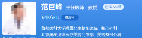 医生介绍:范巨峰是主任医师,教授,博士。还是中华医学美学美容学会全国委员,中华医学会整形外科学会北京分会委员等。曾经参与了很多重大的课题,还到国外知名的医院学习过。在眼部整形、鼻部整形、胸部整形、注射美容等方面,有着十分丰富的经验,成功案例众多。