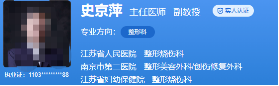 医生介绍:史京萍是主任医师,副教授,博士,硕士生导师。曾经在美国华盛顿大学、韩国峨山医院做过访问学者。在整形行业工作了很多年,临床经验丰富,对于大面积的烧伤救治,各种的软组织缺损的修复、胸部整形等,调节效果不错。