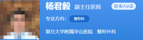 医生介绍:杨君毅是副主任医师,硕士,毕业于上海第二医科大学,在整形行业工作了20多年,获得过上海市科技进步奖二等奖等。还在国家核心的刊物上发表了3篇的论著。