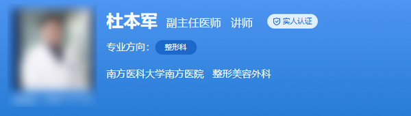 医生介绍:1997年毕业于第一军医大学,同年考入第一军医大学研究生。专业特长:1.颜面五官整形及面部年轻术。2.病理性瘢痕的修复整形及功能重建;3.乳房整形(隆胸,注射隆胸并发症的处理,巨乳缩小等)。在国内外整形美容专业期刊发表论著70余篇。参与或负责国家自然基金等各级基金研究10余项。