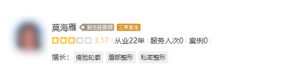 医生介绍:莫海雁凭借专业的手术功底,再加上丰富的专业理论知识,让其在美容整形行业中奋斗了十多年的时间。作为院内的副主任医师,能够结合患者当前的诉求,进行相关建议的提出,并且耐心地解答术前术中以及术后的相关注意事项,让患者更好的了解手术项目,放心的接受这次的医美改造。