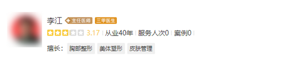 医生介绍:李江医生是科室内的主任,同时担任硕士研究生道士。热衷于美容整形理论知识的研究,注重于手术期间,在技术层面上的精细化处理。坚守本心对患者负责,先后推出了多项技术手法展示,帮助患者减轻痛楚,更有助于术后的恢复。李医生除了在临床方面经验丰富,同时掌握了扎实的理论知识,为医美整形领域,培养了多位优秀的整形医生代表,为医美行业的发展,尽出自己的一份力量。