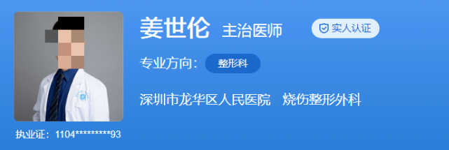 医生介绍:姜世伦在眼鼻整形、光电美容方面具有相当丰富的经验,还擅长瘢痕修复等复查手术。他凭借认真负责的态度、精湛的医术以及高尚的医德,赢得了广大求美者的信赖和好评。