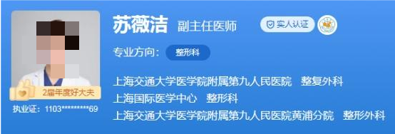 医生介绍:苏薇洁,上海九院整形外科副主任医师、医学博士、美国马里兰大学博士后,她有着近二十的临床工作经验,擅长眼鼻部整形、乳房整形、皮肤美容以及微整形注射等多个项目,发表SCI及核心期刊论著十余篇,还曾多次受邀主持和参加国际国内学术会议大会发言(ASPS/ASRM等)。