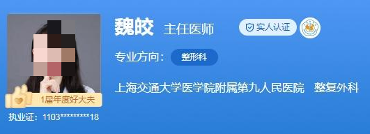 医生介绍:魏皎,上海九院整形外科主任医师、医学博士,她有着十余年专业整形美容工作经验,曾多次受邀主持和参加国际国内学术会议大会发言(ASPS/ASRM等)。两次赴美深造,师从李青峰教授、戴传昌教授,在世界顶尖杂志发表关于鼻整形的SCI论著40余篇。