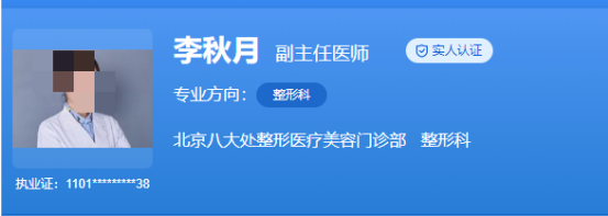 医生介绍:李秋月是北京八大处整形医疗美容门诊部整形科的副主任医师。她在空军总医院激光整形美容中心工作十余年,于2019年调入八大处整形门诊部工作。李秋月医生具有较高审美水平,能将医学与美学完美结合,已经受到业界的广泛好评。