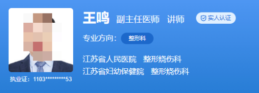 医生介绍:王鸣是副主任医师,他从事整形美容烧伤及手足外科显微修复以及教研工作十余年,曾在2018年—2019年至上海市第九人民医院整复外科进修学习。多年的临床经验让他在面对各种整形问题的时候都能给出针对性的方案进行解决,能做到让人满意。