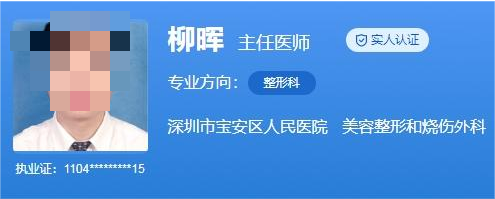 医生介绍:柳晖,主任医师,硕士生导师,他毕业于广州医科大学临床医疗系。广州医科大学临床医疗系,国内国外进修,擅长各类烧伤的救治,创伤后畸形整复,慢性创面修复,面部年轻化,瘢痕的综合治疗以及私密整形等。