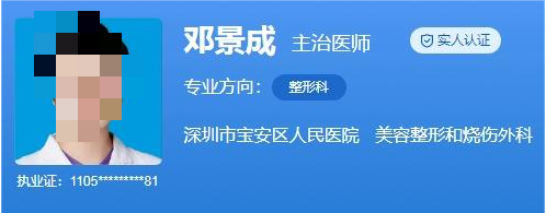 医生介绍:邓景成,主治医师,他毕业于上海交通大学,上海九院整形外科医学硕士。2014年本科毕业于南方医科大学,取得医学学士学位,2017年取得整形外科专业硕士学位,至今从事整形外科工作5年,成功参与完成各类整形、美容及创面修复手术千余例。擅长吸脂塑形,自体脂肪隆乳,自体脂肪填充,纳米脂肪及PRP注射,各类眼、鼻、下颌整形,各类微创注射面部提升与除皱术,疤痕综合治疗,私密整形等。