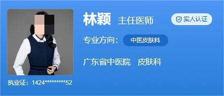 医生介绍:林颖,主任医师,医学博士,研究生导师,她从事皮肤美容整形工作多年,有着娴熟的技术和丰富的临床经验,能够开展多种皮肤美容项目,尤其是在激光美容、皮肤美容以及面部年轻化等方面技术突出。林医生现任广东省中医院大学城医院皮肤科主任,师从国医大师禤国维教授、广东省名中医陈达灿教授、小儿推拿专家王立新教授,专攻研究特应性皮炎、湿疹等过敏性皮肤病。
