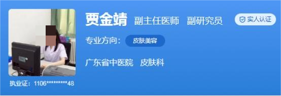 医生介绍:贾金靖,副主任医师,医学博士,皮肤性病学专业,她于2016年毕业于西安交通大学,毕业后西安交通大学第二附属医院皮肤科工作2年。2018年至今广州中医药大学第二附属医院(广东省中医院)博士后。贾医生从事皮肤美容工作近十年来,技术方面逐渐娴熟,经验也十分丰富,尤其在皮肤美容、激光美容等方面的技术尤为熟练,帮助众多爱美人士摆脱了皮肤问题的困扰。
