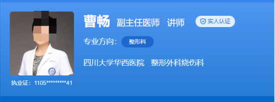 医生介绍:曹畅是四川大学博士,也是成都华西美容科的副主任医师,是中国女医师协会烧伤专业委员会青年委员,四川省医学会整形外科专委会委员,四川省美容整形协会微整形与抗衰老分会秘书长,四川省美容整形协会眼整形分会、修复再生分会、脂肪分会委员。她曾发表论文10篇,SC论文4篇,以负责人身份承担四川省科技厅项目。