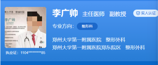 医生介绍:李广帅是郑州大学第一附属医院河医院区整形外科负责人,他也是中国中西医结合学会医学美容专业委员会委员;中国整形美容协会全国委员;中国医师协会美容与整形医师分会瘢痕整形亚专业委员会副主任委员;郑州市医师协会整形专业委员。