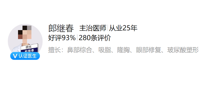 医生介绍:郎继春医生从业二十多年,医学理论非常的扎实,临床经验也是相当的丰富,在私密整形领域有着深入的研究和独特的见解,还擅长鼻部综合、吸脂、隆胸、眼部修复以及玻尿酸塑形等多个整形美容项目。她以亲切、耐心的态度对待每一位爱美人士,认真倾听其需求和疑虑,并详细解答问题,帮助建立对手术的信心。在手术过程中,郎医生会全程关注爱美人士的身体状况和手术进展,确保手术顺利进行。