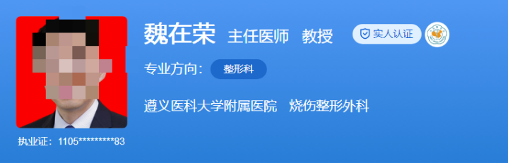 医生介绍:魏在荣教授是遵医附院烧伤整形外科的杰出科主任,三级教授,同时也是贵州省美容整形外科医院的副院长。他拥有丰富的临床经验和深厚的专业知识,擅长私密整形、各种创面修复、器官再造等多个领域。他在学术界也颇具影响力,担任中华医学会整形外科学分会委员、中国研究型医院学会创面防治与损伤组织修复专业委员会主任委员等多个职务,并主编了多部专著。他以其精湛的医术和卓越的学术成就,为烧伤整形外科领域的发展做出了重要贡献。