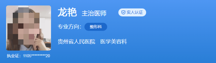 医生介绍:龙艳是贵州省人民医院医学美容科的副主任医师,专业擅长眼部整形、唇部整形、鼻综合整形、自体脂肪移植以及微整形、私密整形等多个领域。她在整形美容领域具有深厚的专业知识和精湛的手术技巧,注重手术细节,追求自然和谐的整形效果。同时,她还积极参与学术交流与合作,不断提升自己的医疗水平和技术实力,曾在北京大学第三医院整形外科进修,并作为黔医人才计划广东班第三期访问学者在南方医院整形美容外科学习,积累了大量的临床经验。龙医生是备受推崇的专家之一,她用自己的专业知识和精湛技艺,为众多女性带来了美丽和自信。
