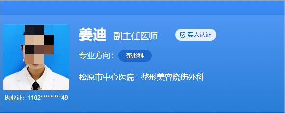 医生介绍:姜迪是松原市中心医院整形美容烧伤外科副主任,副主任医师,她于1998年毕业于吉林医学院临床医学专业,大学本科,2001年在浙江大学附属二院整形科进修1年,现从事烧伤整形科工作已21年,收治数千名烧伤及整形病人,成功救治90%以上大面积烧伤病人近百例。