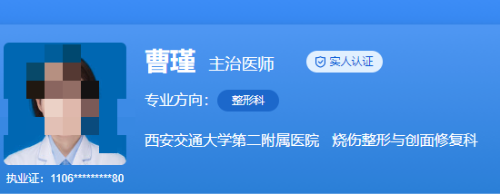 医生介绍:曹瑾医生毕业于西安交通大学医学院整形外科硕士,她从事整形外科专业8年,现任西安交通大学第二附属医院烧伤整形与创面修复科主治医师,有丰富的临床经验。