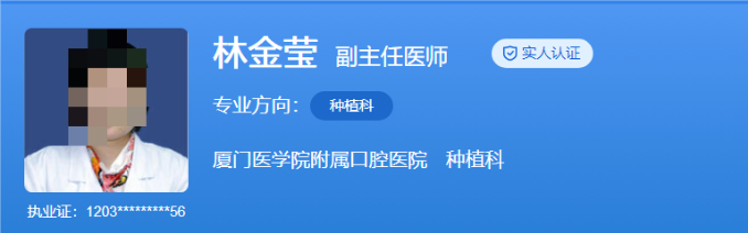 医生介绍:林金莹医生是武汉大学口腔医学院博士生,也是澳大利亚昆士兰科技大学访问学者。她熟练掌握各种种植系统和各种骨质的口腔种植治疗,对前牙美学种植、即刻种植、全口种植等有丰富的经验,同时也擅长解决口腔修复中的疑难杂症,熟练掌握各种活动义齿、固定义齿及全口义齿的修复技术。