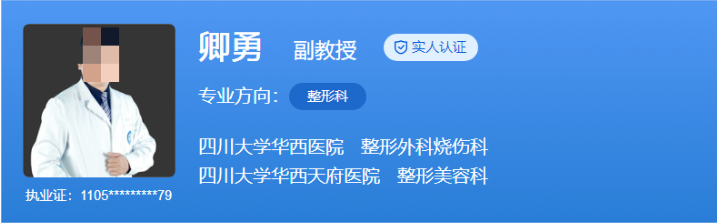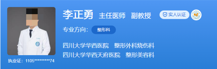 医生介绍:李正勇医生2003年毕业于华西医科大学临床医学系,同年于四川大学华西医院任住院医师。他致力于整形手术微创化,独创多类微创手术方式并在行业内广为推广,同时主持或参与了多个国家级、省级科研项目,并多次获得国家自然科学基金资助。
