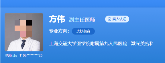 医生介绍:方伟医生是上海交通大学医学院附属第九人民医院激光美容科副主任医师,复旦大学附属华山医院博士后、美国杜克大学访问学者。他从事损容皮肤病与激光医学的医疗、教学及科研工作10年。是世界华人医师学会皮肤病分会委员,上海市中西医结合学会皮肤性病分会委员