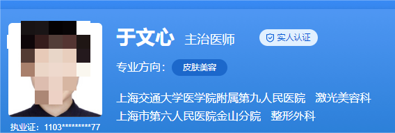 医生介绍:于文心医生是上海九院整复外科医学博士,任职激光美容科。她主要研究方向:脉管畸形的光电治疗,面部年轻化光电治疗。她多次参加激光美容病变学术会议演讲。目前作为项目负责人,已经完成国家级自然科学基金青年项目,2项实用新型专利负责人。近五年来发表国际学术论文30余篇,其中作为第一作者发表SCI文章16篇。