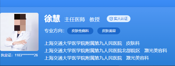 医生介绍:徐慧医生是上海交通大学附属第九人民医院皮肤科科主任,他从事皮肤科临床和科研工作已有20余年,临床经验丰富,曾在日本留学5年,主攻难治性皮肤病理和皮肤美容。擅长面部年轻化、激光美容及微整形、黄褐斑、痤疮等疑难皮肤病的诊治。目前他是中国医师协会美容与整形分会全国常委、中国整形美容协会损伤与救治分会常委、中国整形美容协会激光分会常委。