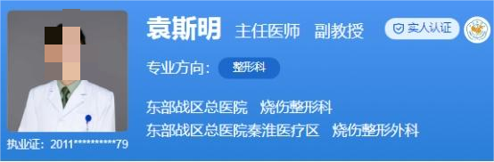医生介绍:袁斯明,主任医师,副教授,博士研究生导师。外科学博士,博士后,哈佛大学医学院访问学者,江苏省医学会整形烧伤分会及医学美学与美容学分会常务委员,南京市医学会整形烧伤分会副主任委员等学术职务。他在中华整形外科杂志、中国美容整形外科杂志等国内权威期刊上发表论文100余篇,发表SCI收录论文32篇。作为负责人申请国家自然科学基金2项。获军队科技进步三等奖1项。