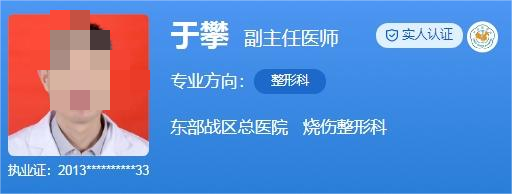 医生介绍:于攀,副主任医师,江苏省美容主诊医师,他主持国家自然基金、江苏省卫健委重点等课题7项,发表sci论文10余篇,获专利6项并转化。