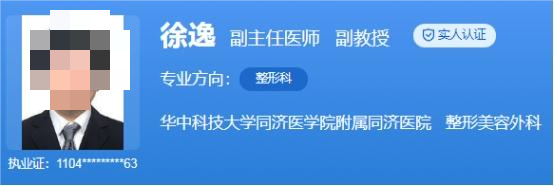 医生介绍:徐逸,副主任医师,他毕业于同济医科大学,医学博士,从事临床工作10余年。任中华医学会医学美学如美容分会脂肪学组全国委员,湖北省医学会医学美容分会委员兼秘书;中国整形美容协会面部年轻化分会委员,武汉市医学会整形外科分会委员,武汉市医师协会整形外科分会常务委员。
