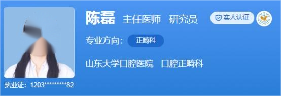 医生介绍:陈磊,现任山东大学研究员,硕士研究生导师,山东大学口腔医院(山东省口腔医院)正畸科主任医师。她从事口腔治疗工作多年,积累了丰富的临床经验,还曾主持国家自然科学基金等国家级课题3项,省市级课题4项, 以第一作者及通讯作者发表SCI论文20余篇,国内核心20余篇, 获军队科技进步二等奖1项,参编口腔正畸学专著6部。